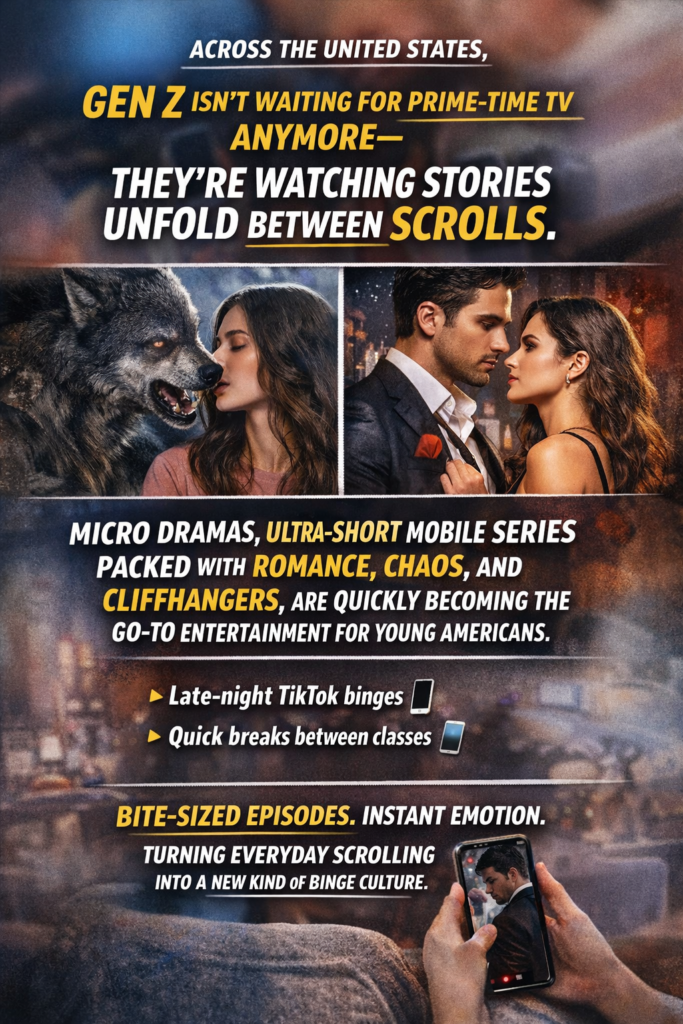 Across the United States, Gen Z isn’t waiting for prime-time TV anymore—they’re watching stories “One minute episodes Endless emotional damage.” unfold between scrolls. Micro dramas, ultra-short mobile series packed with romance, chaos, and cliffhangers, are quickly becoming the go-to entertainment for young Americans. Whether it’s a late-night TikTok binge or a quick break between classes, these bite-sized episodes fit perfectly into Gen Z’s phone-first lifestyle. From werewolf love stories to dark mafia fantasies, micro dramas deliver instant emotion without demanding long attention spans—turning everyday scrolling into a new kind of binge culture.